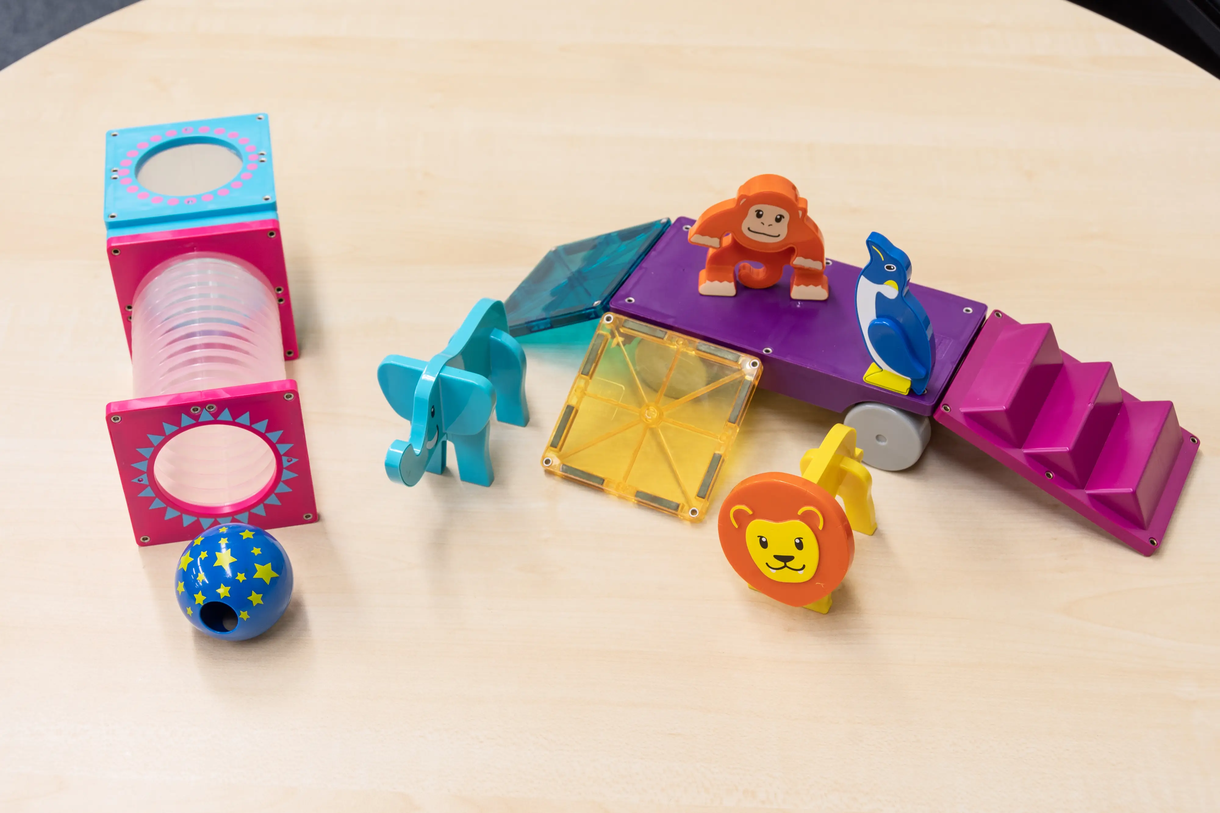 動物のセットは低年齢向けです。四角形だけ入っていても、どうやって何をつくろうかととまどうことがあるのですが、動物がいたら「お水を飲ませてやりたいから、ここに水を置こう」とか「お風呂に入れてやりたいから箱をつくろう」とか、保護者も子どもも、動物がいることでやりたいことが芽生える事例があります。